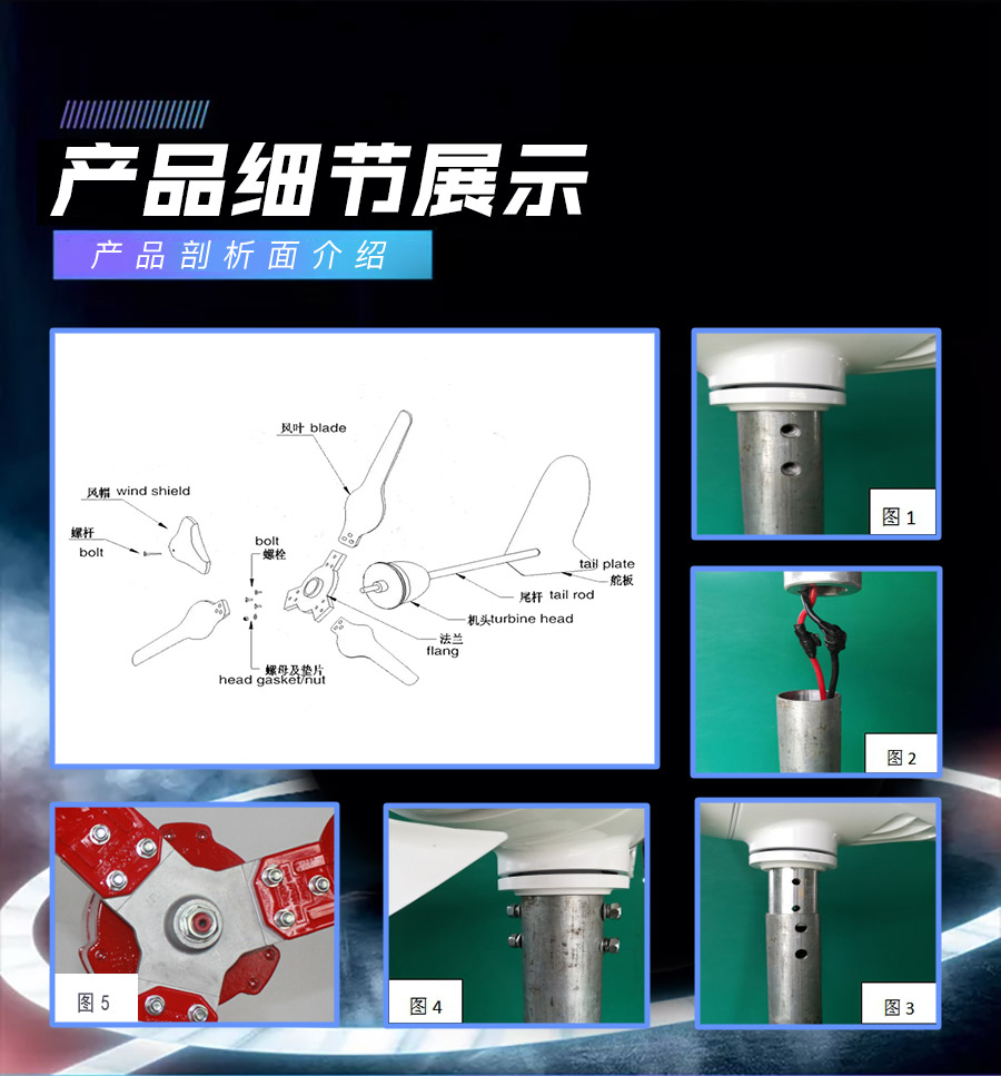 6、獨(dú)特的尾舵預(yù)偏設(shè)計(jì),自動精確對準(zhǔn)迎風(fēng)方向,提高輸出功率同時(shí)兼顧調(diào)整和強(qiáng)風(fēng)保護(hù)。